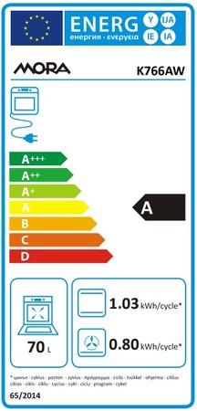 Kombinovaný sporák Mora K 766 AW v bílém provedení s praktickým kovovým příklopem a multifunkční troubou Vás překvapí energeticky úspornou třídou "A" i vnitřním objemem trouby 70 l. Plynové hořáky osazené pojistkou STOP GAS s integrovaným zapalováním jsou kryté dvoudílnou mřížkou STABIL PLUS, která zajistí bezpečný posun nádobí ve všech směrech. Výkonná multifunkční trouba má jedenáct různých programů, nejen klasické pečení, gril s ventilátorem i bez, horkovzdušné pečení, rychlý předehřev, rozmrazování, ohřev talířů a v neposlední řadě i speciální program ECO CLEAN, který Vám zajistí bez velké námahy vyčištění vnitřku trouby a tím je maximálně ohleduplný k životnímu prostředí. Uvnitř trouby je osvětlení a Vy budete mít po celou dobu pečení dokonalý přehled o připravovaném pokrmu. Ve spodní části sporáku je praktický úložný prostor, do kterého snadno uložíte příslušenství v podobě roštu, mělkého plechu a XXL hlubokého pekáče.