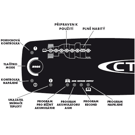 Nabíjecí napětí: 14,4 V, AGM 14,7 V, RECOND 15,8 V, SUPPLY 13,6 V