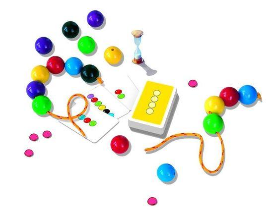 Popis hry: Vyberte karty, které jsou vhodné pro daný věk dětí-hráčů. (Čím více kuliček, tím obtížnější hra). Hromádku karet dejte lícem dolů na stůl. Na začátku kola otoč vrchní kartu na několik vteřin. Hráči se snaží zapamatovat pořadí a počet barevných kuliček. Po znamení začnou navlékat barevné kuličky co nejrychleji na provázek tak, jak si je pamatují z karty. Za každou správně umístěnou kuličku získává hráč žeton. Hráč s nejvíce nastřádanými žetony se stává vítězem!