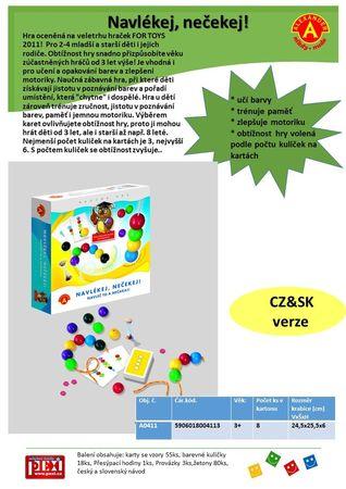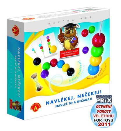 Obtížnost hry snadno přizpůsobíte věku zúčastněných hráčů od 3 let výše! Naučná zábavná hra, při které děti získávají jistotu v poznávání barev a pořadí umístění, která "chytne" i dospělé. Hra u dětí zároveň trénuje zručnost, jistotu v poznávání barev, paměť i jemnou motoriku. Úkolem hráčů je navléci korálky tak je zobrazeno na vylosované vzorové kartě. Čas navlečení korálků můžete omezit přiloženými přesýpacími hodinami (u mladších dětí je nemusíte používat). Výběrem karet ovlivňujete obtížnost hry, proto ji mohou hrát děti od 3 let, ale i starší až např. 8 leté. Nejmenší počet kuliček na kartách je 3, nejvyšší 6. S počtem kuliček se obtížnost zvyšuje.