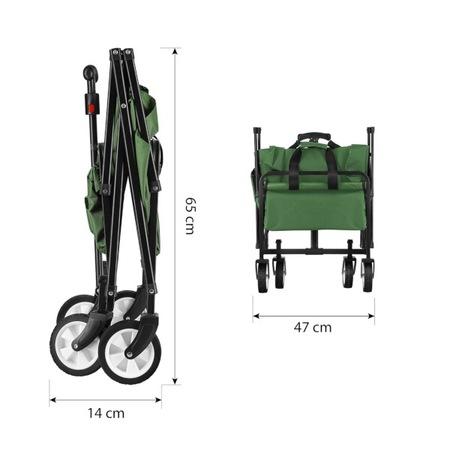 Díky jednoduchému a rychlému způsobu skládání je vozík NC1602 mimořádně praktický a snadno se používá. Lze jej rychle složit a rozložit jediným pohybem, což je mimořádně užitečné při cestování vlakem, letadlem, karavanem nebo autem. Složený vozík má rozměry 46 x 65 x 20 centimetrů a při sklopení madla je výška pouze 48 centimetrů. Složený vozík lze přenášet pomocí popruhů spojených mažetou se suchým zipem. Po rozložení jsou rozměry 75 x 46 x 95 centimetrů (výška bez madla 48 cm) a objem vozíku je 75 litrů. Vozík NC1602 je tedy dostatečně rozměrný aby zvládl převézt veškeré vybavení, ať už jde o stan, spacáky a batoh, nebo například o piknikový koš, piknikovou deku a chutný oběd. V přední části vozíku jsou 2 síťované kapsy, do kterých se pohodlně vejdou například láhve s vodou.