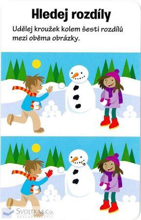 Nakresli strašidelným hlavám obličej. Sleduj stopy a zjisti, která z raket byla na Měsíci. Spoj tečky podle čísel a uvidíš, kdo stojí za Tomem. Ze slov vypadla písmenka. Přijdeš na to, která písmena kam patří? Napiš je do mezer. Nakresli šelmě pruhy jako tygrovi, pak skvrny jako leopardovi nebo hřívu jako lvovi. Krabička obsahuje stíratelný fix a 50 oboustranných karet s více než 100 zajímavých hádanek a úloh k vyřešení a doplnění a obrázků k dokreslení nebo k procvičení postřehu. Karty jsou omyvatelné, takže na ně lze přiloženým fixem psát, kreslit a řešit úkoly stále znovu a znovu. Ideální pro zabavení menších dětí na cestách.