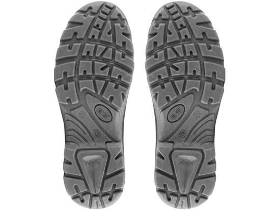 Kotníková bezpečnostní obuv, kožená, s plastovou špicí a planžetou Dyna-Flex®, reflexní doplňky. Materiál: svršek z 1,6 - 1,8 mm štípenkové nubukové kůže (z jednoho dílu), vnější TPU ochrana paty, bez kovových součástí, podšívka z prodyšné oděru odolné textilie, podešev: PU-PU olejivzdorná, antistatická, protiskluzová, odolná proti propichu.