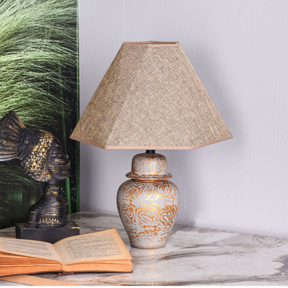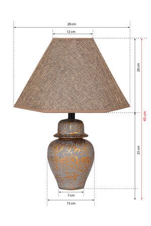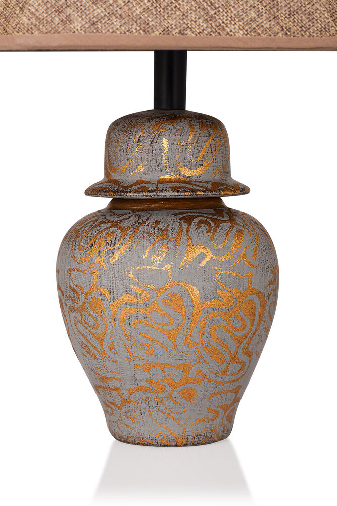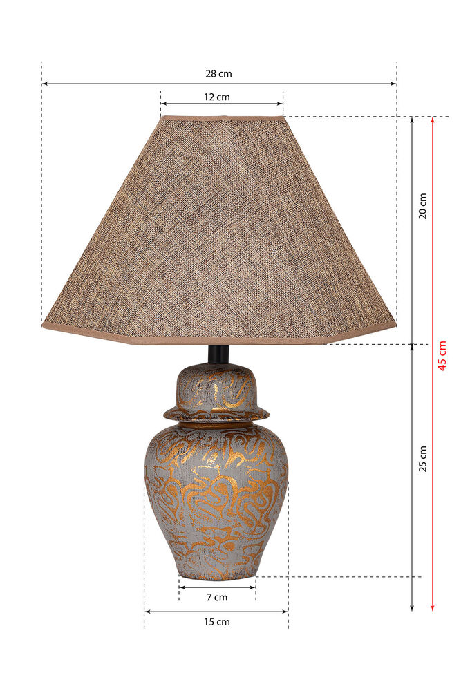 Lampa je opatřena látkovou čepičkou, která jejímu celkovému vzhledu dodává nádech elegance a jemnosti. Průměr víčka 28 cm a výška 20 cm zajišťují dokonalou rovnováhu mezi funkčností a estetikou. Kombinace šedé a zlaté barvy vytváří ohromující vizuální kontrast, který z této lampy činí skutečný výrazný kousek.