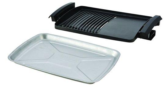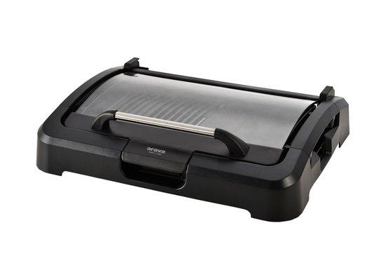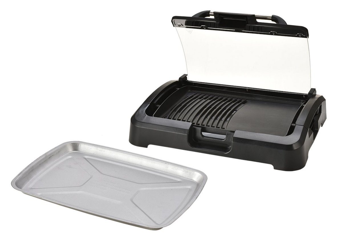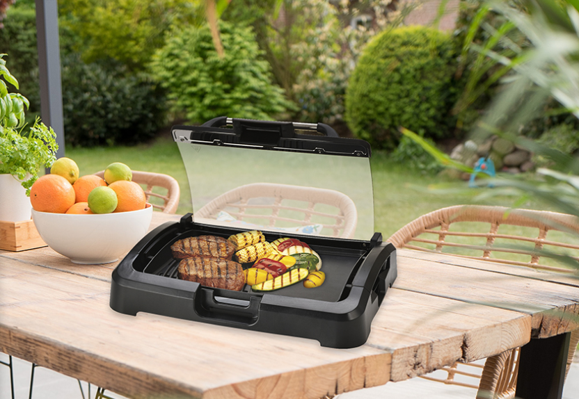Stolní gril se skleněným víkem. Dvojitá nepřilnavá grilovací deska. Žebrovaný a hladký povrch grilu umožňuje smažení, grilování atd. Tepelně izolovaná rukojeť. Odnímatelný tácek na odkapávající tuk. Nástrčkový termostat s plynulou regulací teploty.