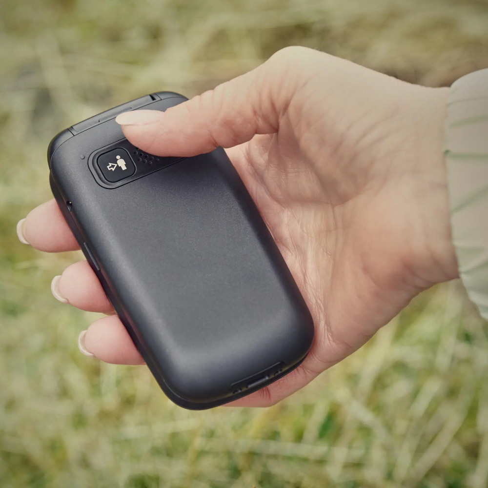 Na zadní straně telefonu najdete SOS tlačítko, které lze aktivovat jediným dotykem. Funkce se automaticky přepne na handsfree režim, což může být zásadní v krizových situacích. -
