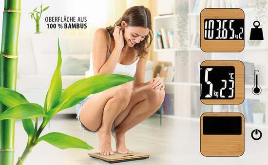 Elektronická bambusová koupelnová váha .LCD displej s integrovanou indikací teploty ve °C. Povrch ze 100 % bambusu - Organická – Udržitelná surovina– Obnovitelná surovina. Jednotky hmotnosti v kg, lb (přepínatelné) > Rozsah měření 5–180 kg v krocích po 50 g. Bezpečná a stabilní díky protiskluzovým nožičkám. Automatické vypnutí prodlužuje životnost baterie. Indikátor slabé baterie.