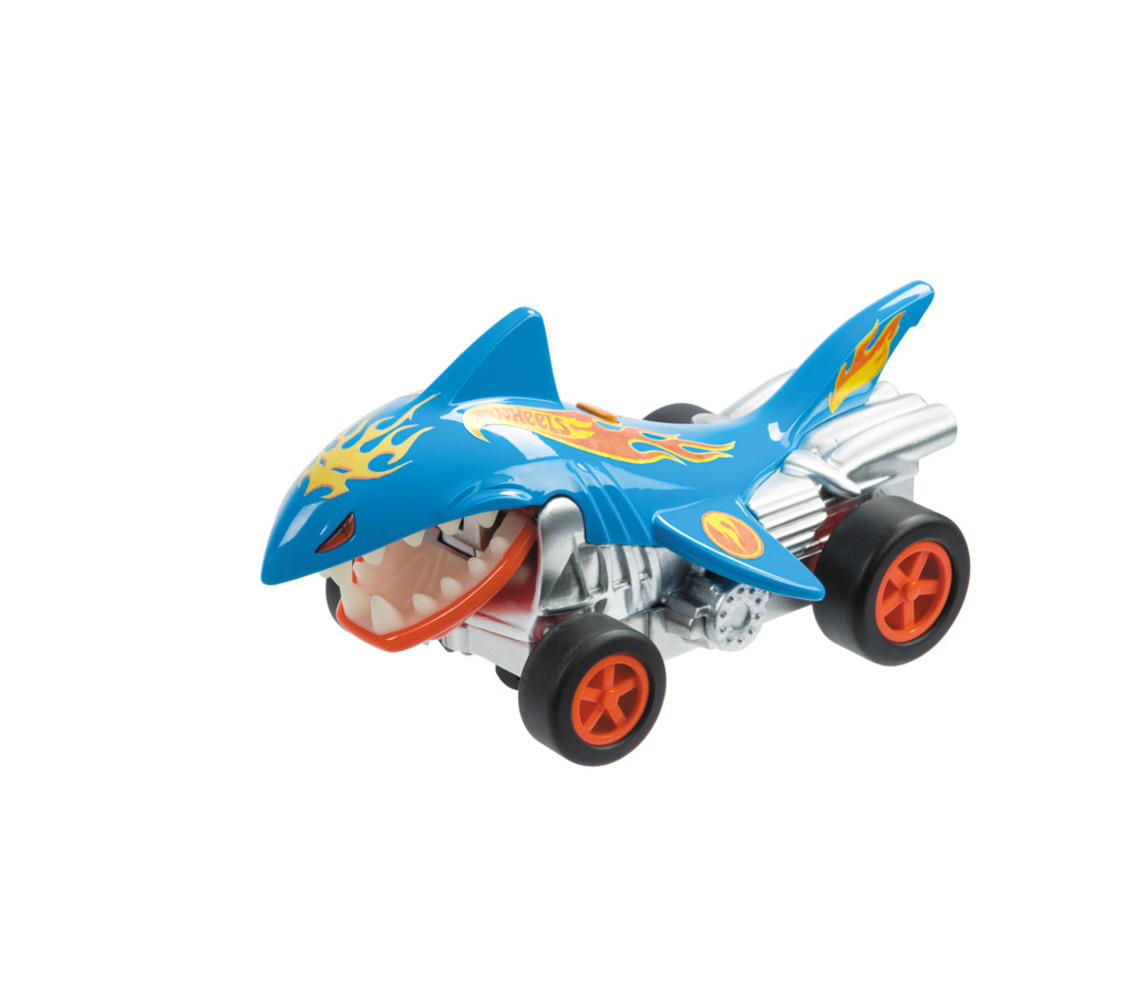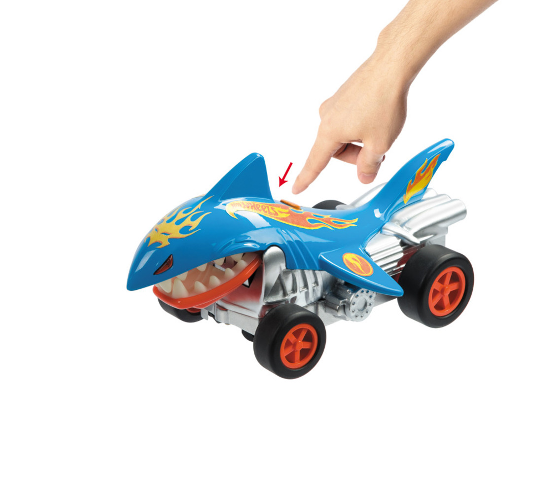 RC auto (1:24) Hot Wheels ve tvaru žraloka. Auto svítí a hýbe pusou. Určeno pro děti od 3 let. Auto vyžaduje 3× AA baterie (jsou součástí balení a dálkové ovládání 2× AA baterie (nejsou součástí balení).