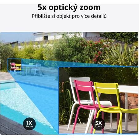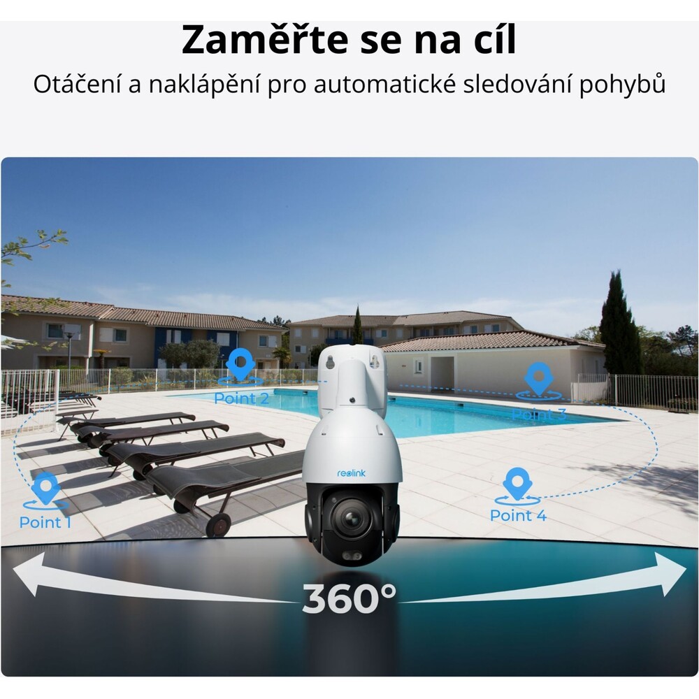 8megapixelová IP kamera typu PTZ nabízí snímač 1/2,8" CMOS s rozlišením 3840 × 2160 obrazových bodů s úhlem záběru 100°–31° (horizontálně) a 5násobný optický zoom. V případě zhoršených světelných podmínek či tmy je přítomen IR přísvit do vzdálenosti až 60 m a barevný LED přísvit. Připojení lze jednoduše realizovat pomocí RJ-45 portu. Díky aplikaci Reolink lze sledovat dění v domácnosti či jiných prostorech 24 hodin denně 7 dní v týdnu odkudkoli skrze váš smartphone. Kamera navíc disponuje zabudovaným mikrofonem a reproduktorem. S kamerou lze otáčet o až 360° horizontálně a až 90° vertikálně. Díky voděodolnosti dle IP66 nabízí jak vnitřní, tak i venkovní možnost použití.