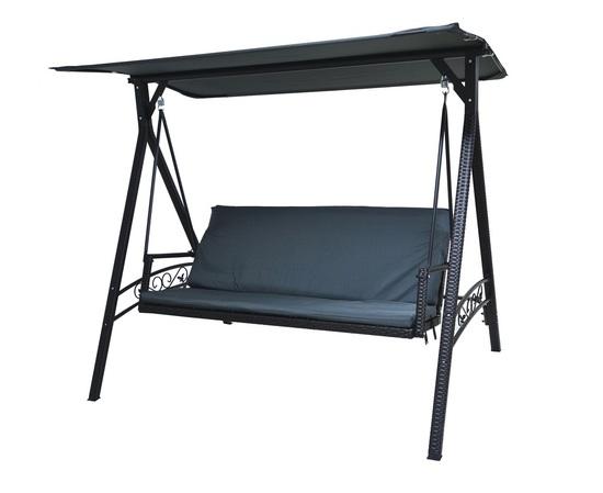 Zahradní houpačka s kovovou konstrukcí a umělým ratanem.