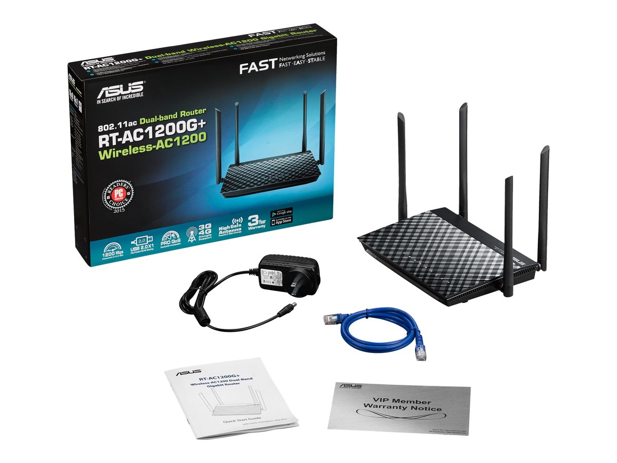 Dvoupásmový gigabitový Wireless-AC1200 router ASUS RT-AC1200G+ se čtyřmi anténami s vysokým ziskem a výkonnou technologií poskytuje extrémně dlouhý dosah. Jeho vysoký výkon standardu 802.11ac plně uspokojí potřeby webového streamování videa v rozlišení až 4K Ultra HD, online hraní s podporou konzolí nejnovější generace, jako jsou Xbox One a PlayStation 4, i ostatních činností náročných na šířku pásma. Víceúčelový port USB 2.0 umožňuje sdílení tiskárny, pevného disku i 3G/4G připojení. Podpora služby ASUS AiCloud vám zprostředkuje sdílení a streamování souborů z domácího počítače na jakékoli zařízení připojené k internetu.