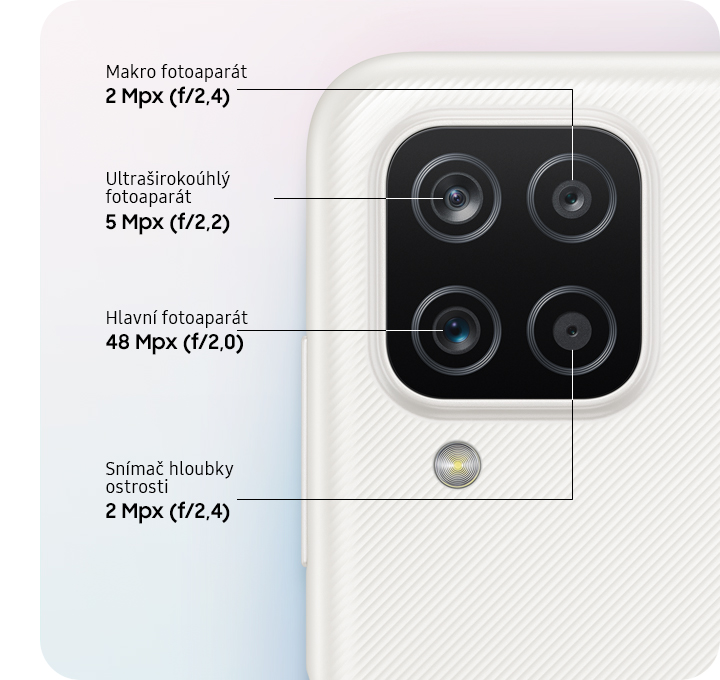 Galaxy A12 kombinuje praktickou designovou estetiku s klasickými barvami. Díky rafinovaným křivkám se pohodlně drží a umožňuje snadnou navigaci po obrazovce. Vyberte si z černé, bílé, červené nebo modré barvy.