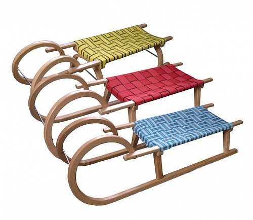 Celodřevěné sáňky se zahnutým obloučkem na ruce. Sedadlo je vyplétané textilními nepromokavými popruhy. Skluznice, vruty a rozpěrka jsou opatřeny protikorodujícím lakem. Sáňky určené pro rekreační využití. Délka sedáku umožňuje jízdu dvěma sáňkařům najednou. Obrázky jsou ilustrativní, barevné provedení se může lišit.