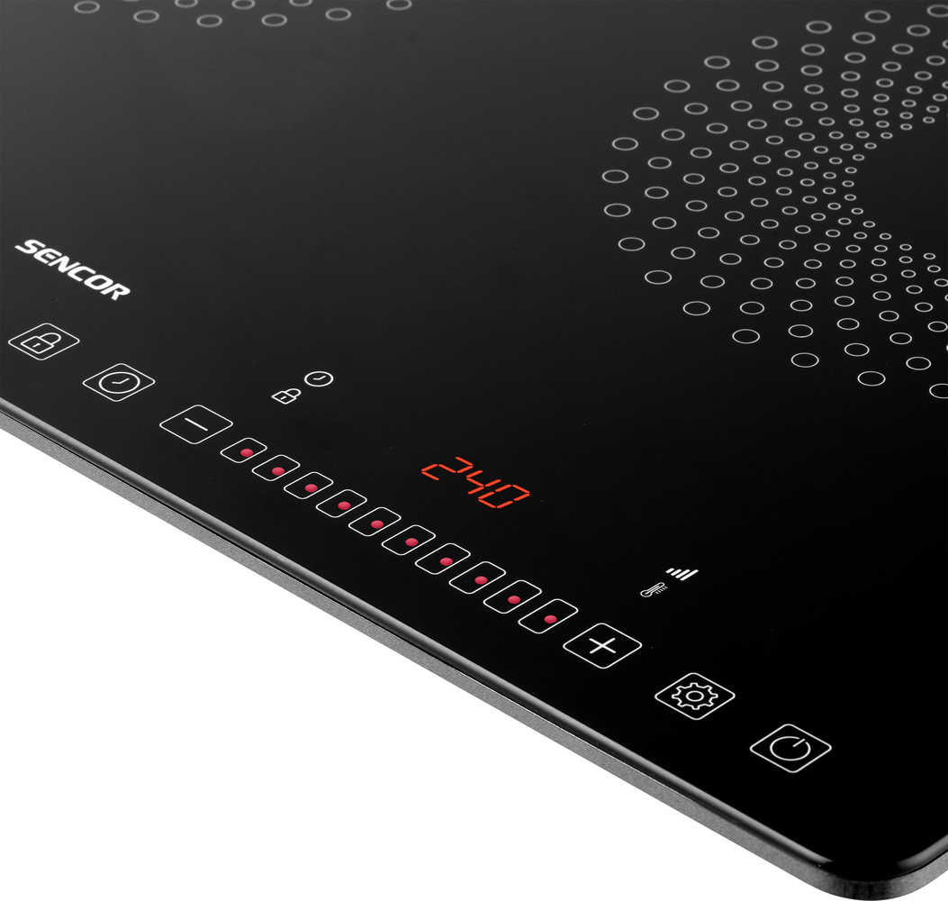 Vařič a jednotlivé funkce ovládáte dotykovými tlačítky. Teplotu a výkon nastavíte pouhým pohybem prstu vpravo a vlevo, tzv. sliderem. O teplotě a výkonu vás informuje přehledný velký LCD displej s červeným podsvětlením.