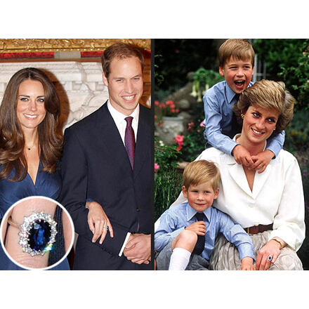 Zásnubní prsten, který nyní nosí Kate na ruce je dědictvím po zesnulé princezně Dianě . Je to výrazný prsten z 18 karátového zlata s velkým modrým přírodním safírem, kolem něhož je vsazeno 14 diamantů .