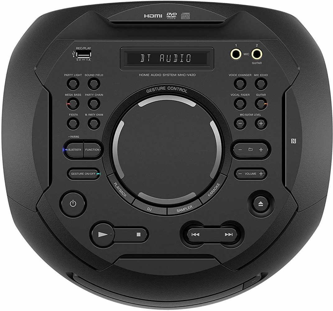 Díky výkonnému audiosystému MHC-V42D s basy s dlouhým dosahem si všichni účastníci párty dosyta vychutnají rytmus všech skladeb. Barevné párty osvětlení je synchronizováno s hudbou a pomocí gest nebo prostřednictvím smartphonu vám umožňuje proměnit se v dýdžeje.