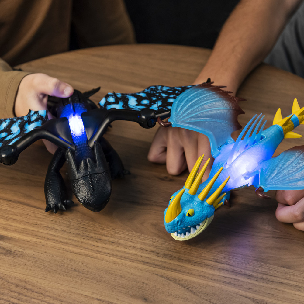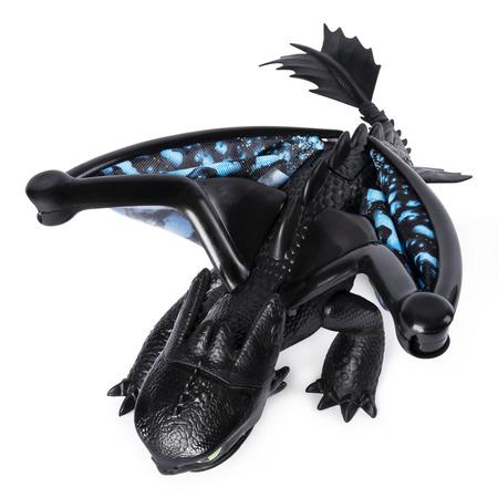 Prožíjte dobrodružství jako ve filmu Jak vycvičit draka 3 s velkou Bezzubkou! Tento drak má hýbající nohy, zařivá světla a řvoucí zvuky. Zmáčněte tlačítko u draka Huccupse a on rozevře svá křídla z bioluminescentních vláken, světla a zvuky. Bezzubka je velmi detailně vyrobená a vypadá úplně jako filmová postavička.