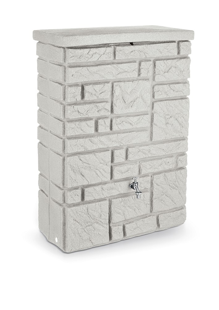 Sud na dešťovou vodu s objemem 300 l. Design reálné kamenné zdi. Možnost přidání kohoutku nebo spojky pro zahradní hadici. Horní otvor s víkem. Rozměry (š x v x h): 40 x 118 x 80 cm