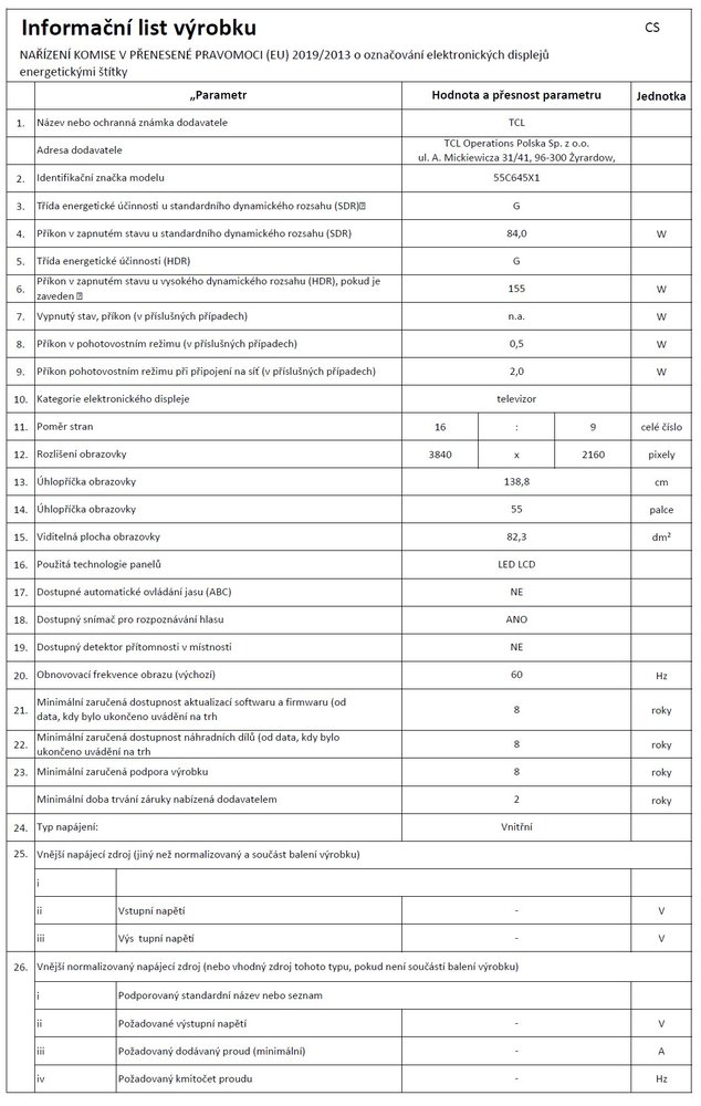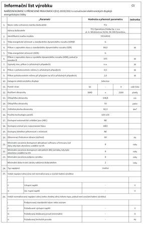 TLC 55“ SMART QLED televizor s úhlopříčkou 139 cm a s rozlišením 4K (3840 x 1080 px). Technologie obrazu: Dolby Vision, HDR, HDR10+. Zvuk Dolby Atmos. Zvukový výkon 20 W. Funkce a technologie: EPG, teletext, Hbb TV, SMART TV s OS Google TV, Chromecast, internetový prohlížeč, Miracast, ovládání hlasem, Google Assistant, DLNA, Bluetooth, Wi-Fi, Skylink Fastscan, Skylink Live TV, Netflix, Kuki, Apple TV, AirPlay apod. Herní režim (HDMI 2.1, ALLM, VRR, AMD FreeSync, 120 Hz, GeForce Now). Typ tuneru DVB-C/T2/S2. VESA 200 x 300. Energetická třída G.