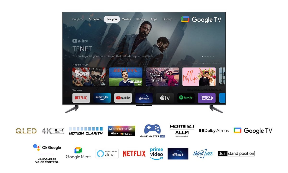 TLC 55“ SMART QLED televizor s úhlopříčkou 139 cm a s rozlišením 4K (3840 x 1080 px). Technologie obrazu: Dolby Vision, HDR, HDR10+. Zvuk Dolby Atmos. Zvukový výkon 20 W. Funkce a technologie: EPG, teletext, Hbb TV, SMART TV s OS Google TV, Chromecast, internetový prohlížeč, Miracast, ovládání ...
