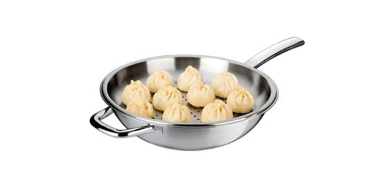 Luxusní wok z prvotřídní nerezavějící sendvičové oceli je vynikající pro smažení, vaření i napařování při přípravě asijských pokrmů. Díky třívrstvému sendvičovému provedení nádoby je teplota uvnitř woku rovnoměrná a stálá. Wok je opatřen klenutou poklicí pro optimální cirkulaci páry a regulací odchodu páry, prostorným napařovacím sítem, napařovací a odkládací mřížkou. Masivní rukojeť a úchyt z prvotřídní nerezavějící oceli pro komfortní a bezpečnou manipulaci. Vhodné pro všechny typy sporáků – plynové, elektrické, sklokeramické a indukční, vhodné do myčky. Recepty uvnitř balení. 5 roků záruka.
