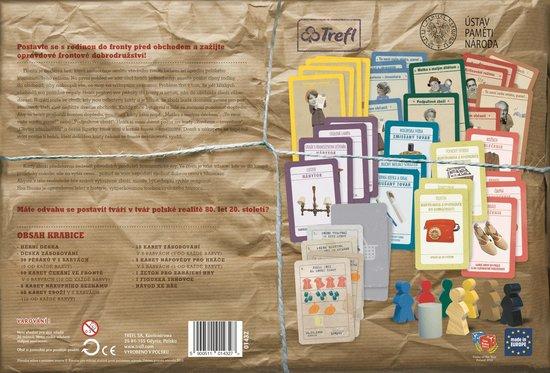 Postavte se s rodinou do fronty před obchodem a zažijte opravdové frontové dobrodružství. Fronta je desková hra, která znázorňuje realitu všedního života během let úpadku polského komunistického režimu. Na první pohled se zdá úkol hráčů jednoduchý: musíte členy rodiny poslat do obchodu, aby nakoupili vše, co mají na nákupním seznamu. Problém tkví v tom, že pět blízkých obchodů má prázdné regály. Hráči postaví své pěšáky do fronty a netuší, zda do obchodu zboží vůbec dorazí. Napětí roste ve chvíli, kdy jsou odhaleny karty a je jasné, že zboží bude dostatek pouze pro pár šťastlivců, kteří stojí nejblíže dveřím obchodu. Každý chce být první a lidé se začínají posouvat dopředu. Aby se hráči protlačili frontou dopředu, používají karty jako např.: "Matka s malým dítětem", "To není vaše místo, pane!" nebo "Podpultové zboží". Hráči si musí dávat pozor na karty "Zavřeno - inventura", "Chyba zásobování" a černé figurky, které stojí v každé frontě - šmelináře. Domů s nákupem se úspěšně vrátí pouze ti hráči, kteří dokážou karty čekání ve frontě nejšikovněji využít. Karty zboží představují šedesát původních produktů komunistické éry. Ve čtvrti je také tržnice, kde se dá koupit prakticky cokoliv, ale za vyšší cenu... pokud se vám nepodaří sjednat dobrou cenu s trhovcem. Abyste v této realistické hře získali vytoužené zboží, musíte být schopni rychle reagovat. Hra fronta je opravdu lekcí z historie, vyšperkovanou trochou cynického humoru. Balení obsahuje: - herní deska - deska zásobování - 30 pěšáků v 6 barvách - 5 karet nákupního seznamu - 60 karet zboží - 15 karet zásobování - 5 karet nápovědy pro hráče - 1 žeton pro zahájení hry - 1 figurka trhovce - návod ke hře Vhodné pro děti od 12 let.
