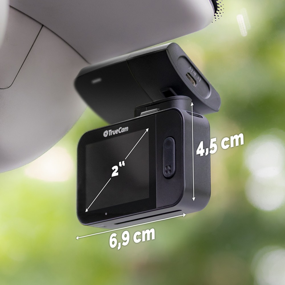 TrueCam M5 GPS WiFi vám svou velikostí nebude nikdy bránit ve výhledu. Přesto má ale skvěle čitelný 2“ displej s širokým pozorovacím úhlem. Snadno si tak prohlédnete poslední záběr nebo upravíte nastavení. Kamera je díky své matně černé barvě velice nenápadná a kolemjdoucí si jí jen stěží všimne.