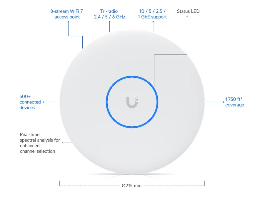 Overview Dimensions O215 x 32.5 mm (O8.5 x 1.3") WiFi Standard WiFi 7 Spatial Streams 8 Coverage Area 160 m2 (1,750 ft2) Max. Client Count 500+ Uplink 10 GbE Mounting Ceiling, Wall (Lite Mount Included) Power Method PoE++ Performance MIMO 6 GHz 2 x 2 (DL/UL MU-MIMO) 5 GHz 4 x 4 (DL/UL MU-MIMO) 2.4 ...