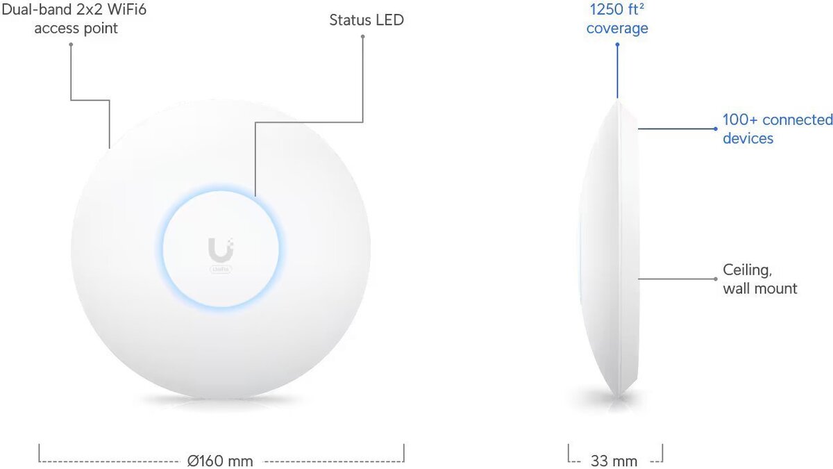 UniFi 6+ Access Point je základní Dual Band WiFi 6 AP (2.4GHz a 5GHz) do menších hal, skladů či kanceláří. U6+ je schopen dosáhnout skvělých propustností. V pásmu 5 GHz (2x2 MIMO) je to 2402 Mbps při použití 160 MHz šířkou pásma a ve 2.4 GHz (2x2 MIMO) je to 574 Mbps, což mu umožňuje podporovat více než 300 současně připojených klientů. Pro připojení do sítě má Access Point Gigabitový ethernet s podporou aktivního (802.3at) ale i pasivního (44 až 57V) PoE.