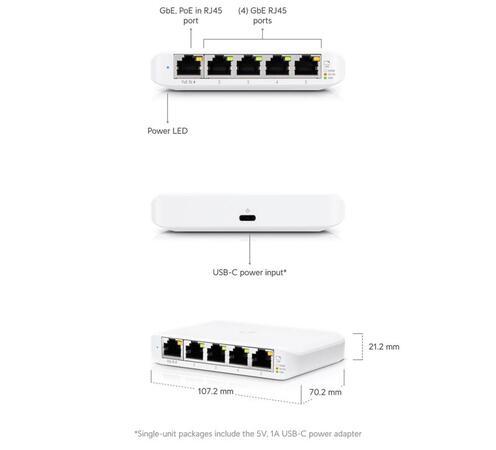 USW-Flex-Mini je malý 5-portový Gigabitový switch se správou přes UniFi Controller od Ubiquiti Networks v desktop provedení s prvním portem podporující PoE In. PoE IN na Eth1 Jeho největší předností je gigabitový POE IN na portu č.1 pro snadnou expanzi sítě i do míst, kde není možné vybudovat elektrickou zásuvku. Switch lze napájet jak aktivně (802.3af/at), tak pasivně pomocí 44-57V adaptéru. Switch lze kromě PoE napájet i přes USB-C adaptér se specifikací 5V/1A. Obsah balení: - 1x Zařízení