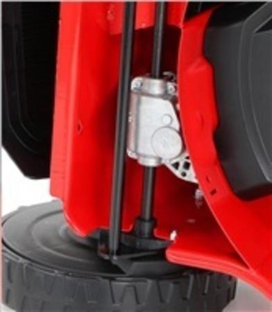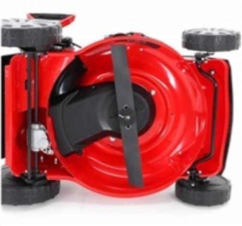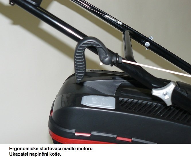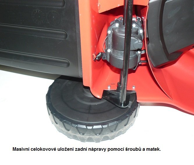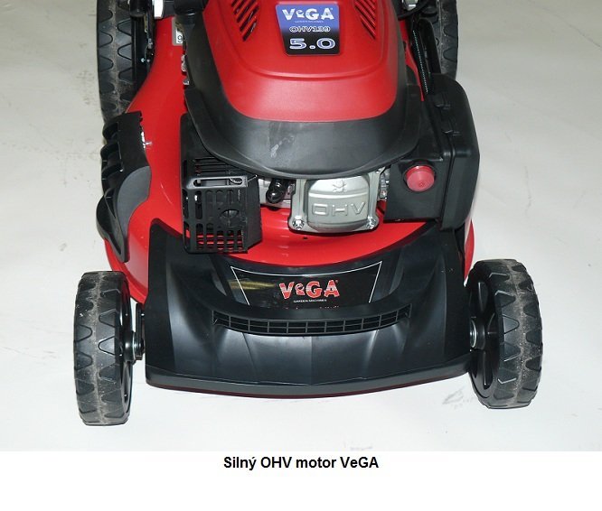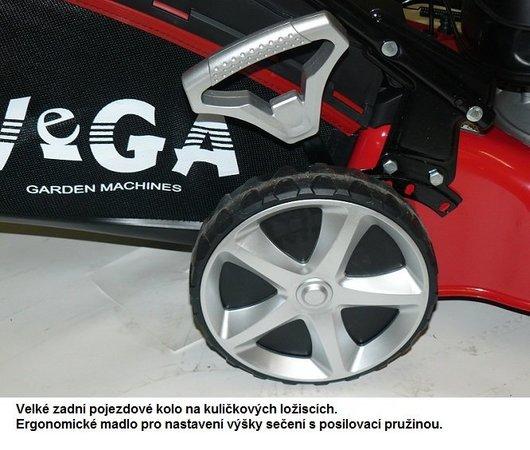 Velká zadní pojezdová kola i přední kola jsou uložena v oboustraných kuličkových ložiscích, centrální nastavení výšky sečení je u značky VeGA také samozřejmostí, jako ergonomické měkčené madlo.