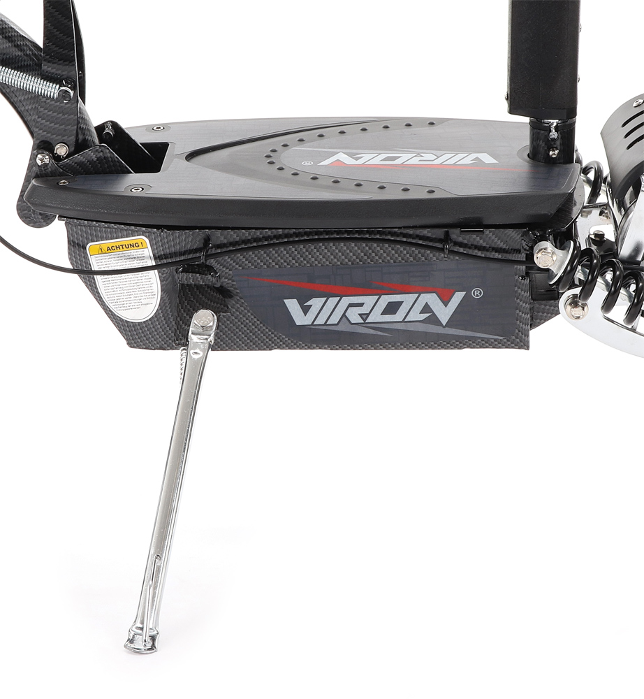 Elektrický skútr VeGA VIRON E-Scooter vás spolehlivě doveze na výlet i do práce. Disponuje motorem s výkonem 1 000 W, který se postará o vaši bezstarostnou jízdu rychlostí až 32 km/hod. K ještě většímu pohodlí při jízdě poslouží sedlo. Skútr má v sobě zabudovanou baterii s vysokou kapacitou, kterou dobijete z nuly na 100 % zhruba za 6–7 hodin. Následně s ní můžete jet až do vzdálenosti 30 km, než je potřeba jí znovu dodat energii. Velká nafukovací kola zajistí pohodlnou jízdu na různých typech povrchů. Kdykoliv potřebujete, můžete skútr odložit a nechat stát za pomoci výklopného stojanu. Elektrický skútr vás pohodlně dopraví do práce i na výlet.