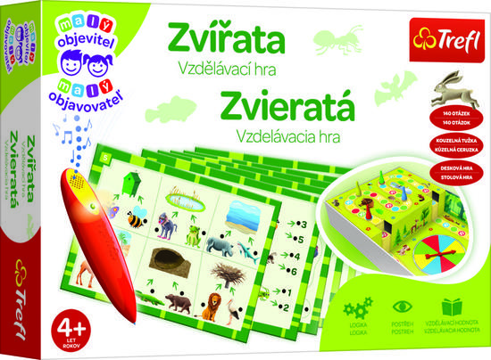 Veselá hra pro děti s kouzelným perem! Vzdělávací paměťová hra z edice her pro nejmenší Malý objevitel . Zvířata světa je veselá hra, která rozvíjí slovní zásobu u dětí a učí je základním počtům a rozeznávání tvarů a barev. Chceme tě pozvat k prozkoumání všech koutů světa a k hledání jejich obyvatel! Hra vzbudí zvědavost dětí a umožní jim poznat různé zvířecí druhy. Víš, která zvířata žijí v džungli nebo v hlubinách moře? Víš, jak se jmenují, co jedí a jak vypadají jejich domy? Díky barevným ilustracím a zábavným úkolům budou vaše děti hru hrát s potěšením. Při hře si dítě bude rozvíjet vnímání a představivost a bude si procvičovat logické myšlení. Součástí balení je i magické pero, které po zvolení správné odpovědi vydá zvukový signál. Úkoly na deskách pokrývají různé obory související s předškolním vzděláváním: - písmena a první slova - slovní úkoly - čísla a počty - barvy a tvary - úkoly související s logickým myšlením - schopnost třídit položky Balení obsahuje baterií napájenou kouzelnou tužku, 16 oboustranných karet s úkoly, hrací deska na kartonové vložce v krabici, losovací šipka, 4 figurky a návod ke hře. Doporučeno pro děti od 4 let. Kolekce her Malý objevitel je určena pro děti ve věku od 2 do 6 let. Každá hra byla navržena tak, aby podporovala poznávací a intelektuální rozvoj dětí. Rozvíjí logicko-matematické myšlení, stimuluje komunikační schopnosti a obohacuje slovní zásobu. Cvičí vyzuálněpohybovou koordinaci, trénuje paměť a soustředění, a povzbuzuje představivost a kreativitu. Hry z kolekce Malý objevitel v sobě snoubí zábavu a učení a možnosti tvůrčího trávení volného času s dítětem.