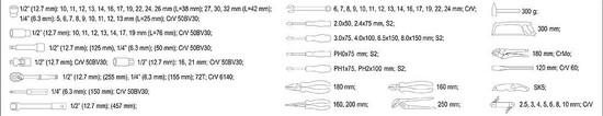 Gola sada 1/2", 1/4" obsahuje 79ks: nástavců, prodlužovacích nástavců, ráčny s plastovou rukojetí, kloubové nástavce očkoploché klíče, kleště, kladivo a další příslušenství. Vyrobené z kvalitní chromvanadiové a chrommolybdenové oceli CrV6140, CrV50BV30, CrV60, CrMo a S2 s funkcí AS-DRIVE.
