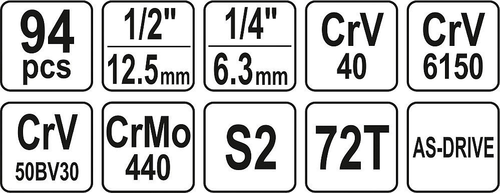 Gola sada 1/2" a 1/4" obsahuje 94ks: nástavců, prodlužovacích nástavců, ráčny s plastovou rukojetí a další příslušenství. Vyrobené z kvalitní oceli CrV40, CrV6150, CrV50BV30, CrMo440 a S2 s funkcí AS-DRIVE. Ráčny mají jemný 72 zubý chod.