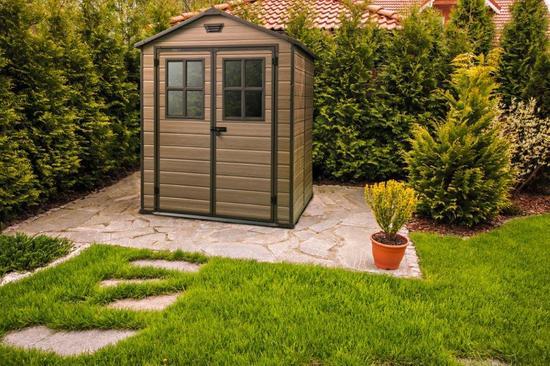 7 600l zahradní domek, skladování zahradního i dílenského nářadí, sportovního náčiní a dalšího vybavení, sedlová střecha vydrží zatížení až do 100 kg/m2. Zvýšená podlaha, dvojité stěny a okna. Polypropylenová pryskyřice. Světle hnědá barva.